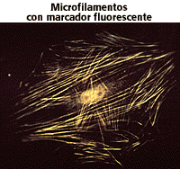 Los microfilamentos son finas fibras de proteínas como un hilo de 3-6 nm de diámetro. Están compuestos predominantemente de un tipo de proteína contractil llamada actina, la cual es la proteína celular mas abundante. La asociación de los microfilamentos con la proteína miosina es la responsable por la contracción muscular. Los microfilamentos también pueden llevar a cabo movimientos celulares, incluyendo desplazamiento, contracción y citocinesis.