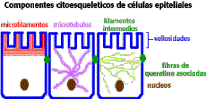 Los microfilamentos se proyectan dentro de las vellosidades, dando forma a la superficie celular. Los microtubulos crecen del centrosoma a la periferia de la célula. Los filamentos intermedios conectan células adyacentes a través de desmosomas.